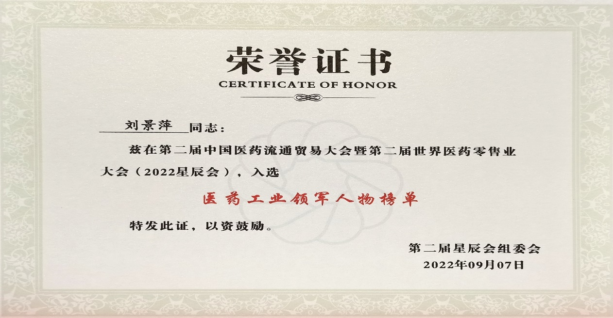 本次星辰会期间,PA官方网站斩获颇丰,获得多项行业奖项及荣誉。在开幕式上,刘景萍董事长荣获“医药工业领军人物”称号。